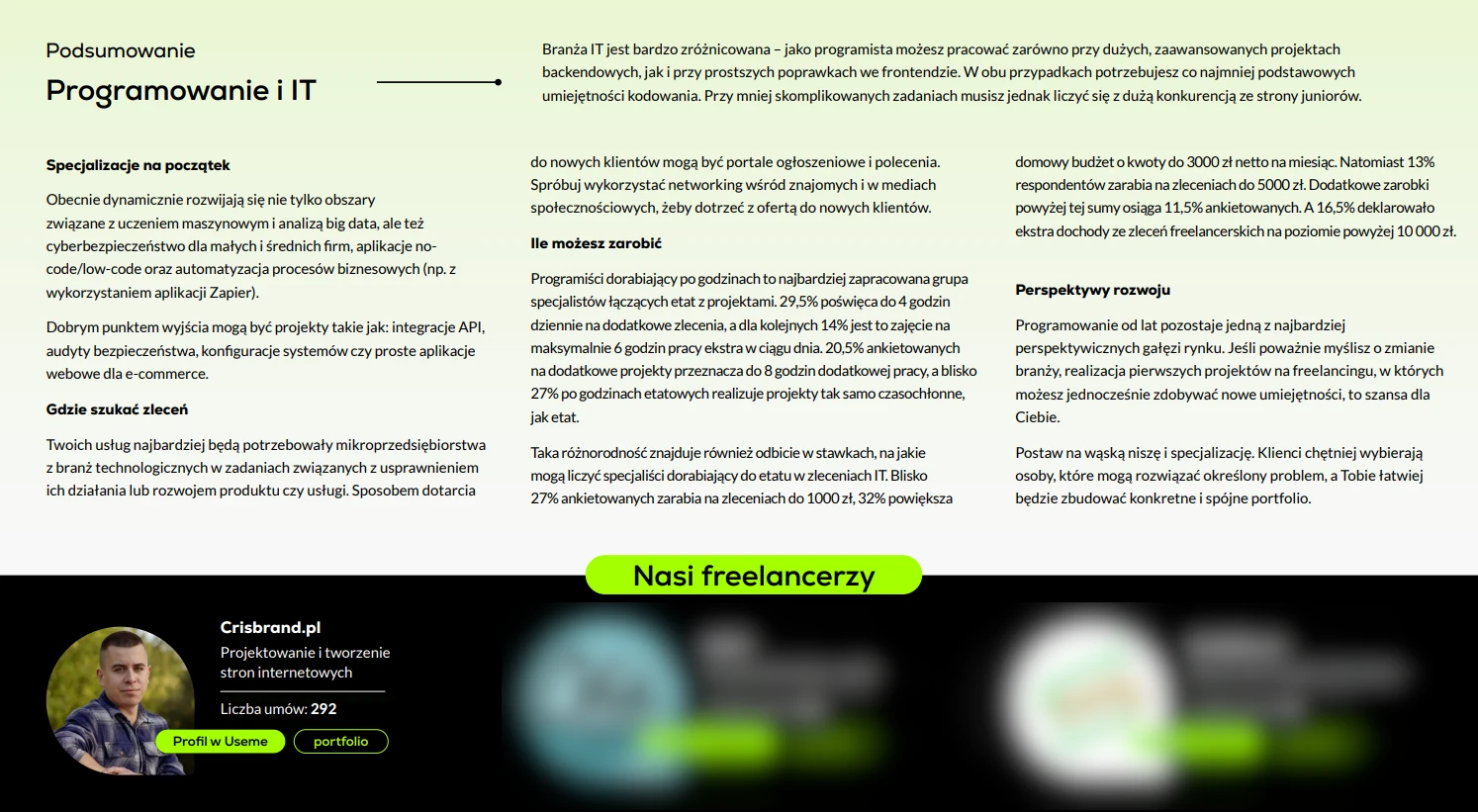 W 2025 roku zostałem wyróżniony jako freelancer z Wrocławia w kategorii Programowanie / IT w prestiżowym raporcie Useme.com „Freelancing po godzinach. Jak specjaliści łączą etat z dodatkowymi zleceniami”. Raport zyskał uznanie i został opublikowany m.in. na łamach „Rzeczpospolitej”, co potwierdza, że freelancing może być nie tylko dodatkiem do pracy etatowej, ale realną ścieżką rozwoju w branży.